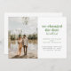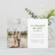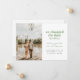 Si vous avez changé la date de votre mariage, mais avez décidé que vous ne pouviez pas attendre pour vous marier et vous êtes enfuis à la place, partagez votre grande nouvelle avec vos proches avec cette annonce de mariage en fuite. Elle comporte du texte vert mousse et gris foncé avec un espace pour une seule photo ainsi que les détails sur votre mariage en fuite. Le verso de la carte comporte un espace pour un message personnel.