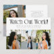 Modern and minimal graduation announcement photo card featuring 3 photos on the front and 1 on the back. The text at the top says "watch out world!" Add the graduate's name, information, and message to personalize this card.