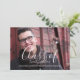 Classe Delicate moderne et élégante de Vingt-dix-huit Faire-part de Graduation Photo avec un design calligraphique manuscrit tendance en blanc. Ce carte photo de graduation en typographie classique et élégant est facile à personnaliser avec une photo du diplômé et leurs détails de graduation. Pour en savoir plus sur les options de personnalisation, cliquez sur Personnaliser où vous modifiez la couleur de l'arrière - plan à l'arrière de l'invitation.