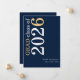 White Gold Text 2026 Navy Blue Graduation Announcement. Available digitally and printed. A modern stylish typographical design to announce the news of your graduate, with stylish large typography rotated and to the left hand side at the top in white and gold on a classic navy background. Easily personalise the rest of the text. including your message on the back