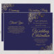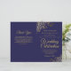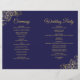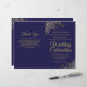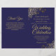 Cette combinaison invitation et programme de mariage présente un élégant design bleu marine et or avec de délicates boucles et volutes en faux foil dans les coins. Le devant comporte l'invitation, tandis que l'intérieur contient les détails de la cérémonie et du cortège nuptial. Le dos dispose d'un espace pour une note de remerciement.