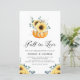 Tombez amoureux ! Cette invitation de fête de fiançailles sur le thème de l'automne présente un décor de citrouille à l'aquarelle avec des tournesols jaunes, du coton et des feuilles d'eucalyptus. Personnalisez-la en ajoutant les noms, la date, l'heure, le lieu et d'autres détails de l'événement. Cette invitation rustique au tournesol est parfaite pour des fiançailles en automne.