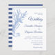 Créez des faireparts de mariage pour les événements sur la plage côtière avec un design élégant bleu et blanc orné d'une peinture d'algues à l'aquarelle et d'une typographie moderne, ainsi que d'un motif rayé au verso. C'est également une idée parfaite pour un mariage sur le thème des fonds marins. Le modèle permet de le personnaliser facilement - tapez vos noms, lieu et endroit.
