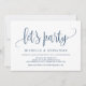 Cette carte d'invitation au design calligraphique moderne (faisons la fête) est parfaite pour votre annonce/ célébration de mariage en fuite. Ajoutez vos détails dans une police/ lettrage bleu marine assortie.