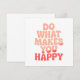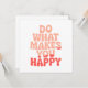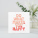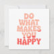 Éclairez la journée de quelqu’un avec cette carte de voeux joyeuse et stimulante, avec l’expression inspirante "Faites ce qui vous rend heureux" dans des lettres vibrantes et colorées. Que vous le donniez à un ami ou que vous l'utilisiez comme un rappel quotidien pour diriger avec gentillesse, ce design livre un message d'encouragement, de joie et de bonnes vibrations.