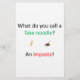 Voulez-vous entendre une blague drôle ? Comment appelez-vous une fausse nouille ? Une impasta !