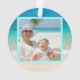 Ambiance de vacances de plage familiale pour le sapin de Noël. Eau tropicale bleue de l'océan et sable de plage avec coquillages est le design de ce ornement rond. Customisez avec du texte d'un côté et une photo de l'autre. Starfish et un dollar de sable décorent l'avant.