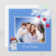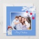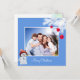 Famille personnalisée, pin blanc orné de boules de Noël rouges et bonhomme de neige mignon sur la carte de voeux de Noël bleu ciel. Vous pouvez ajouter votre photo préférée !