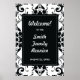 Affiche de bienvenue de la Réunion de famille avec arrière - plan damassé noir et blanc. Texte entièrement personnalisable pour personnaliser votre événement familial. L'affiche peut être accrochée au mur ou à la porte, ou montée à bord ou au chevalet à l'entrée de votre fête.