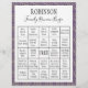 Profitez de ce jeu de bingo amusant lors de votre prochaine réunion de famille. Trouvez les matchs de votre propre famille pour vous amuser! ! Arrière - plan carrelé violet et or noeud.