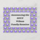 Annoncez votre réunion de famille avec ces cartes postales dynamiques et peu coûteuses. La motif à l'avant est ornée d'un motif à pois bleu vif contre un arrière - plan gris foncé. Le centre dispose d'un rectangle bleu-gris qui fournit l'arrière - plan pour votre faire-part, nom de famille et année. Le dos de la carte postale offre beaucoup de place pour les détails de votre événement.