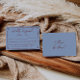 Une carte de réponse de mariage calligraphiée simple et élégante. Qui a un fond bleu et un cadre à mainlevée bordeaux rouge profond et des informations.