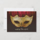 Fancy Flourish Invitation De Mascarade De Mariage Dorée. Une carte de réponse de masque de mascarade élégante et sophistiquée pour tous vos invités pour vous faire savoir s'ils participeront à votre mariage. Le masque est présenté ici dans des tons dorés avec des fioritures noires fantaisistes dessus et un fond de fioritures fantaisistes dans des tons dorés et noirs.