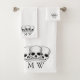 Bath towel set, consisting of a face cloth, hand towel and bath towel with a skull design. You can have this bath towel set in any colour by changing the background just click the edit this design button and choose the colour of your choice. You can also customise the text to read whatever you want. Should you require any help with customising then contact us through the message link on this page. Skull design bathroom towel set