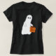 Un adorable petit fantôme tenant un tour ou un sac de gâterie fait un très mignon T-shirt d'Halloween. Parfait sur une chemise noire ou marine. Personnalisez avec votre propre nom. Ou le message de votre choix. À qui ?