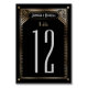Une belle carte de numéro de table de la réception de mariage. Ce modèle dispose d'un arrière - plan noir avec des graphismes à l'ombre d'un faux or. Un double cadre rectangulaire englobe le mouvement géométrique Art Déco des années 1920 Great Gatsby style motif.