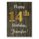 Ce simple design de carte d'anniversaire comporte le message "Joyeux 14ème anniversaire", avec le "14ème" ayant une apparence fausse or. Il est également doté d'un nom personnalisé et d'un arrière - plan d'apparence en faux bois. Il pourrait être donné à quelqu'un qui célèbre son quatorzième anniversaire.