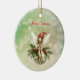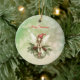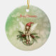 Une jolie fée portant un casquette rouge est assise sur un ornement de Noël vert décoré de feuilles saints et de baies tandis que des flocons de neige tourbillonnent autour d'elle. Les mots "Joyeux Noël" peuvent facilement être changés à n'importe quel accueil que vous préférez et le dos peut également être personnalisé.