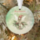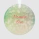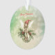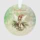 Une jolie fée portant un casquette rouge est assise sur un ornement de Noël vert décoré de feuilles saints et de baies tandis que des flocons de neige tourbillonnent autour d'elle. Les mots "Joyeux Noël" peuvent facilement être changés à n'importe quel accueil que vous préférez et le dos peut également être personnalisé.