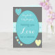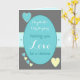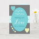 Personnalisez cette carte de mariage grise, turquoise, jaune, avec des cœurs, pour la mariée et le marié, avec leurs noms.