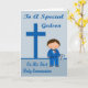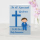 Félicitez votre filleul pour sa première sainte communion avec un adorable garçon vêtu d'un costume bleu avec une cravate arc et une jolie fleur rose sur son revers tenant une Sainte Bible. L'Arrière - plan est bleu avec une croix et un texte bleu foncé.
