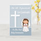 Félicitez votre arrière-petite-fille pour sa première sainte communion avec une adorable fille habillée d'une robe blanche avec un voile de fleurs, des boutons roses et une ceinture rose. L'Arrière - plan est bleu avec une croix blanche avec ombrage bleu clair et texte blanc. L'intérieur peut être personnalisé par vous si vous le souhaitez.