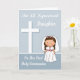 Félicitez votre fille pour sa première sainte communion avec une adorable fille vêtue d'une robe blanche avec un voile de fleurs, des boutons roses et une ceinture rose. L'Arrière - plan est bleu avec une croix blanche avec ombrage bleu clair et texte blanc.