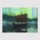 Une image légèrement stylisée d'un longship viking naviguant la nuit sous les aurores boréales, il y a quelques icebergs; la plupart de l'équipage est endormi. Le texte espagnol "Feliz Navidad" apparaît en bleu et blanc éclatant. Ajoutez votre propre texte supplémentaire.