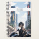 Peinture de style Anime d'une jeune femme aux cheveux noirs courts en tenue noire debout près de sa moto noire sur une rue animée de la ville.