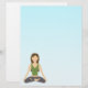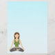 Illustration vectorielle élégante d'une belle femme brune faisant du yoga. La femme est assise dans la position traditionnelle du lotus. Elle porte un débardeur vert et un pantalon gris foncé. Le fond est un joli dégradé de bleu.