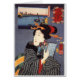 C'est une impression couleur japonaise par l'artiste Utagawa Kuniyoshi (19ème siècle). Il a créé beaucoup de copies comportant des femmes, et c'est encore de la série. Dans cette copie nous voyons une femme japonaise, habillée dans le kimono japonais traditionnel (avec un beau motif noir et blanc le décorant), tout en lisant un livre. Des livres au Japon en ces jours ont été également imprimés, l'écriture et les images. Derrière elle il y a une peinture (ou une copie) de ce qui ressemble à un pêcheur japonais travaillant à côté de la rivière. Rouge, bleu, jaune, or et des couleurs vertes ont été également employés dans cette illustration. Utagawa a signé la copie dans des caractères de kanji et des Hiragana (écriture japonaise).