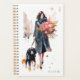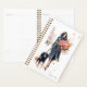 Une femme chic et élégante portant un bouquet de fleurs avec son chien. Cet agenda peut être personnalisé avec un nom en bas à droite et une date en haut à droite. Le dos est d'une teinte neutre.