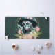 Femme étonnante ornée d'un étonnant maquillage de crâne à sucre. Les couleurs vives et les motifs complexes racontent des histoires de vie et de mort, lui donnant un look gai mais respectueux qui est parfait pour Día de los Muertos. Ses cheveux longs et flottants brillent d'un turquoise brillant qui s'écoule au-dessus de ses épaules comme une cascade de couleur. Il capte la lumière et améliore l'humeur festive du design. L'arrière - plan brille dans des bleus et des verts profonds qui rappellent un ciel nocturne, tandis que des fleurs roses et blanches délicates dansent autour d'elle. Ces accents floraux non seulement ajoutent de la couleur, mais symbolisent aussi l'amour et le souvenir du défunt.