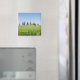Aimant souvenir avec une ferme avec cyprès et brassant des grains de blé au printemps dans la vallée du Val d’Orcia en Toscane, Italie et le texte : 'Toscane, Italie'.