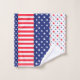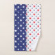 Une collection de serviettes de toilette de motifs étoilés rouges, blancs et bleus accrochées à un porte-serviettes.