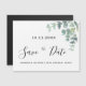 Une carte magnétique moderne Save the Date pour une fête d'anniversaire de 50e (ou tout âge). Un arrière - plan blanc chic décoré de verdure d'eucalyptus couleur vert, de feuilles et de sprigs. Personnalisez et ajoutez une date et un nom/âge 50. Lettres de couleur noire. Le texte : Save the Date est écrit avec un grand script de style à la main tendance.