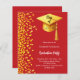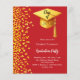 Une invitation moderne et élégante à Graduation Party. Un arrière - plan rouge décoré de faux confettis d'or et une grande casquette de graduation dorée au goût. Personnalisez et ajoutez un nom et des détails du parti. Texte blanc. 1 feuille = 1 invite imprimé bord à bord.