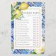 Cette élégante douche nuptiale "devinez qui épouse ou épouse ?" carte de jeu de douche nuptiale dispose d'un arrière - plan blanc avec carreaux bleus méditerranéens, fleurs et citrons/agrumes en aquarelle. Personnalisez-le selon vos besoins. Vous pouvez trouver des produits correspondants dans mon magasin.