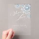 Fêtez l'amour avec notre Invitation Acrylique Fête des mariées neige en amour, avec d'élégants flocons de neige aquarelle en bleu poussiéreux doux. Le script de calligraphie moderne et les accents de parties scintillant argentée ajoutent une touche chic et festive, parfaite pour une douche de mariée hivernale au pays des merveilles. Cette invitation combine à merveille un thème d'hiver douillet avec des éléments de design raffinés, ce qui en fait le choix idéal pour une fête de Noël nuptiale. Des textes entièrement personnalisables vous permettent de le rendre vraiment personnel.