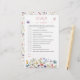 Gardez votre douche nuptiale éclairée et amusante avec ce jeu de papillon élégant et Fleur sauvage "Over or Under". Avec ses oeuvres d'art florales et papillons raffinées, cette carte magnifiquement conçue s'intègre parfaitement à un thème de fête haut de gamme ou de jardin. Les invités devinent si chaque déclaration au sujet de la mariée ou du couple est finie ou sous la vérité - un joli ajout riant à votre événement.