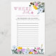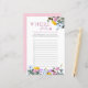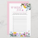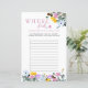 Fête des mariées Carte de jeu, personnalisée avec les noms de la mariée et du marié. Le design a une bordure florale de fleurs sauvages en jaune lilas rose et bleu avec de jolies lettres roses. Conçu pour le jeu photo de la douche mariage ou nuptiale "où étaient-ils" ou "où sont-ils allés" avec des lignes numérotées pour vos invités à ajouter jusqu'à 12 réponses.