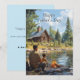 Jolie aquarelle image un père et son fils assis au bord d'un feu de camp au bord de la rivière. Il y a un mignon cabine en rondins de pays sur la rive de la rivière avec de grands pins.