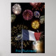 The French Drapeau Tricolore amid a Bastille day fireworks display.