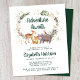 Invitation de fête prénatale hivernale rustique et économique avec des illustrations aquarelles d'animaux de la forêt, de fleurs, de verdure et d'étoiles dorées et de flocons de neige. "L'Aventure Attend" et le nom de la future maman sont écrits dans un script vert foncé.