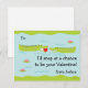 Illustration fantaisiste d'un alligator tenant un coeur rouge dans sa bouche. C'est sur le point de l'offrir à l'autre opérateur dans l'étang. Le texte dit : "J'aimerais saisir l'occasion d'être votre Saint-Valentin !". Personnalisez avec le nom d'un enfant.