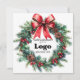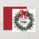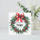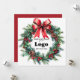 Cartes "Joyeuses Fêtes" personnalisées avec le logo de votre entreprise, une couronne festive avec du pin et du gui, un nœud rouge élégant et un motif rouge au verso. Fournitures promotionnelles pour les Fêtes, vous pouvez commander en gros pour vos employés ou comme fournitures de marque et de marketing pour remercier vos clients.