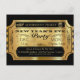 Billet de style tendance et vintage, prêt à être personnalisé avec vos propres détails. Billet doré avec fond noir, horloge vintage, cadeau, masque de bal masqué et graphiques d'étoiles et typographie rappelant le style des années 1920. Ajoutez vos propres détails dans un script calligraphique. Annoncez votre prochaine soirée du Nouvel An avec cette invitation à un événement amusant sur le thème du billet!