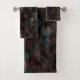Serviette de bain Ensemble de 3 équipements de salle de bain et décoration d'intérieur accessoire avec Colorful Floating Fireworks Afficher l'image de design d'artwork par TheFabricSeal à Zazzle est la belle couleur tonale de couleur colorée de la palette de tons noir et gris. Cette aquarelle numérique graphique art peinture abstrait présente un éventail de coups de pinceau, étincelles et éclaboussures fanés représentant une vue aérienne d'un grand feu d'artifice exposé ci-dessous d'un drone et d'une caméra volant au-dessus. Couleurs terre de bleu turquoise et vert, cuivre, rouille, bordeaux, rouge, violet, tan, sable, beige et un arrière - plan noir foncé.