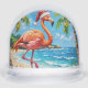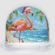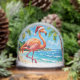 Flamingo vibrante et animée au milieu d'une scène de plage tropicale, ornée fièrement d'un chapeau de Père Noël. Les plumes de l'oiseau sont une symphonie de fuchsias chaudes, de pêches et d'oranges subtiles, illustrées de coups de pinceau vivants et texturés. Le sable doré est parsemé de frondes de palmiers vertes et l'océan céleste brille sous un ciel brillant, créant une atmosphère de célébration ludique.