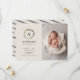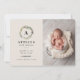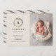 Feuillage rustique, carte de faire-part de naissance photo à fleurs et cerfs. Avec un beau feuillage aquarelle, des fleurs blanches, une tranche de bois et une écriture manuscrite.